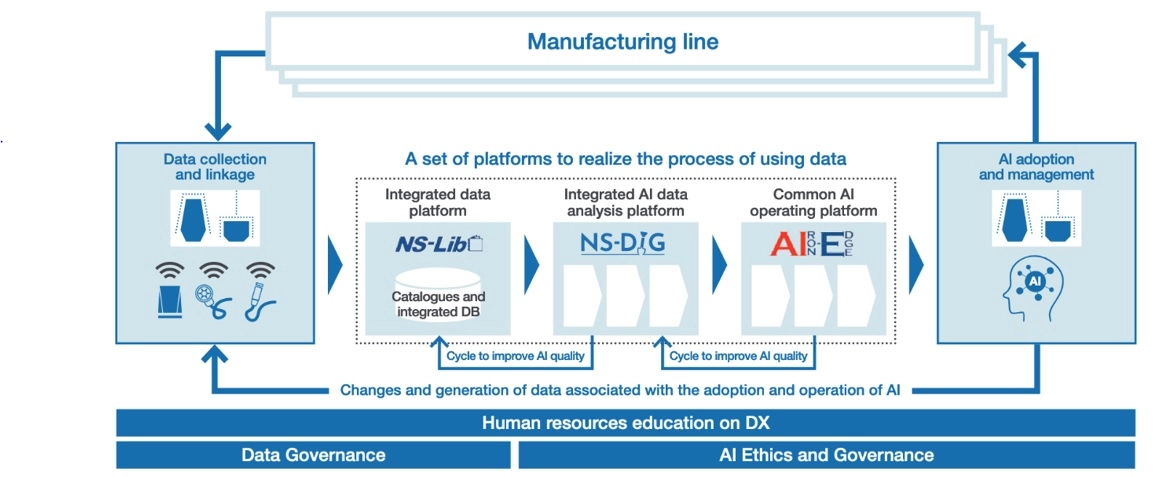 Going forward, we intend to create an integrated data platform for collection and management of data, which is a key to digital innovation. Our goal is to enable all employees to perform their "strength in connecting," and "strength in maneuvering" data at best. We are establishing an environment where all our employees can access information needed accurately at the right time. NS-DIG™, a platform for comprehensive data analysis, will also be introduced to support intelligent production. In addition, KAMONOHASHI™, NSSOL's AI development tool, will be adopted so that even our Citizen data scientists who are not system experts can develop AI models. Further, AIRON-EDGE™, a base of edge computing, will facilitate easy adoption of AI models at worksites, by use of the container technology. These platforms will allow us to realize digital innovation at an early stage. We are hence promoting efficient development, use, and optimization of the information systems across the Company.