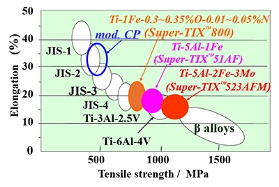 Our original alloys, Super-TIX™ series uses inexpensive generic additive elements (e.g., iron (Fe), copper (Cu), silicon (Si), oxygen (O)) instead of expensive additive elements whose prices drastically fluctuate depending on market sentiment, such as vanadium (V), chromium (Cr) and nickel (Ni). These titanium alloys are almost as strong as the representative high strength titanium alloy Ti-6Al-4V.