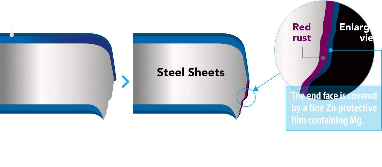 ZAM™-EX shows better red-rust resistance (durability) on cut edge than any other coated steel sheet.