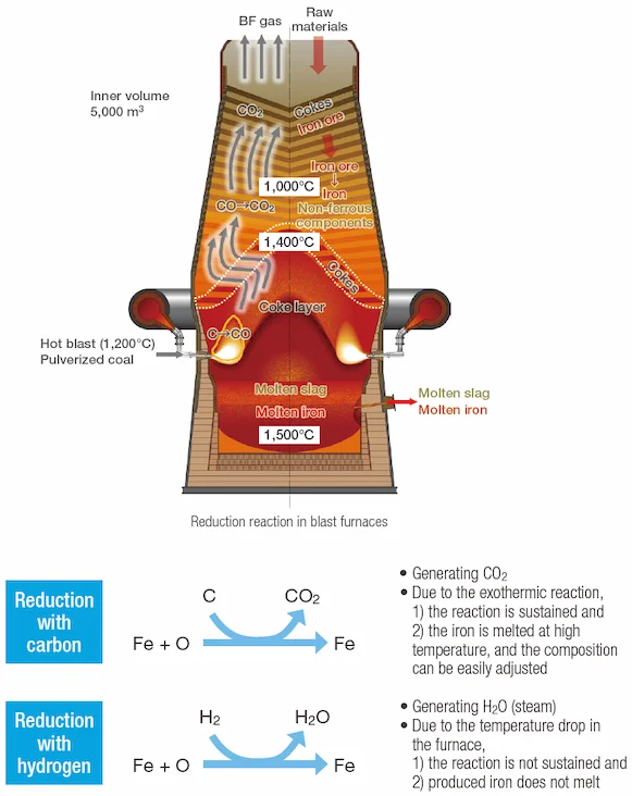 In nature, iron exists as oxidized iron ore. To produce steel products, oxygen must be removed (= reduced) from iron ore. This reduction process has been carried out by the blast furnace (BF) and the basic oxygen furnace (BOF), using carbon such as coal.