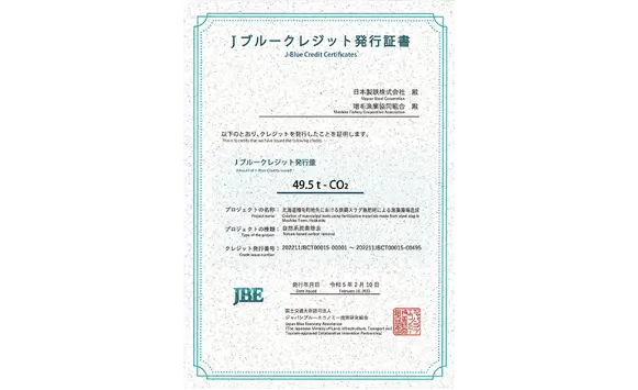 In fiscal 2022, we calculated the CO2 fixation effect in a seaweed bed creation project, on which we have been working over the past nearly 20 years, applying for J-Blue Credit™ certification jointly with the Mashike Fishery Cooperative Association (Mashike, Hokkaido). J-Blue CreditTM was certified and issued for 49.5 t-CO2 — the amount of CO2 absorbed and fixed (blue carbon) over the five years (2018 – 2022).