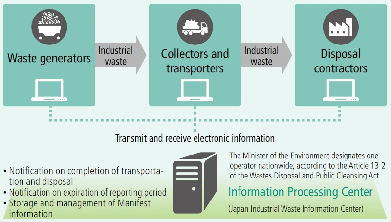 The e-Manifest system is a scheme in which the three parties, namely, waste generators,collectors and transporters, and disposal contractors, exchange e-Manifest information on the network via the government’s information processing center.