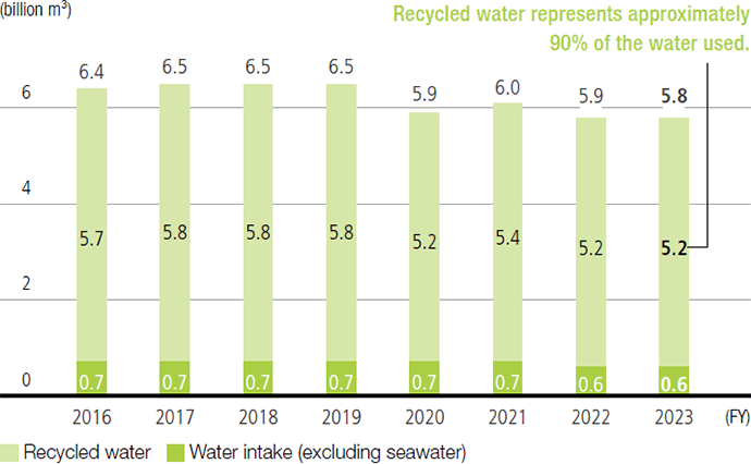 Throughout the company, approximately 90% of the water is derived from recycled or reused water to reduce wastewater discharge, at all of our steelworks and factories combined. We try not to waste precious water resources, and to minimize wastewater discharge. To achieve this, we make daily efforts to maintain and improve the performance of wastewater treatment equipment, and the inspection and control of wastewater quality.