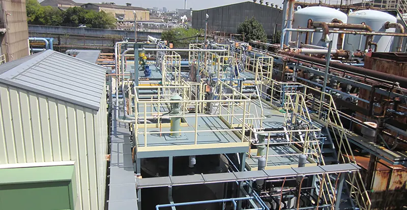 At our manufacturing sites, weirs (liquid-proofing barriers) are installed around storage tanks to prevent them from leaking out to the outside in the event of a chemical solution leaking.