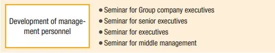 In order to develop management personnel who will be responsible for the future of the Group, we get to share policies and issues through dialogue with management and other means. In addition, we provide training according to the stage of their rank as candidates for management executives so that they can develop a broader perspective. Specifically, the program provides them with the opportunity to learn about corporate and organization management, business management skills (financial, business strategy), global management, etc.—contents which lead to strengthen the exchange and collaboration of personnel.