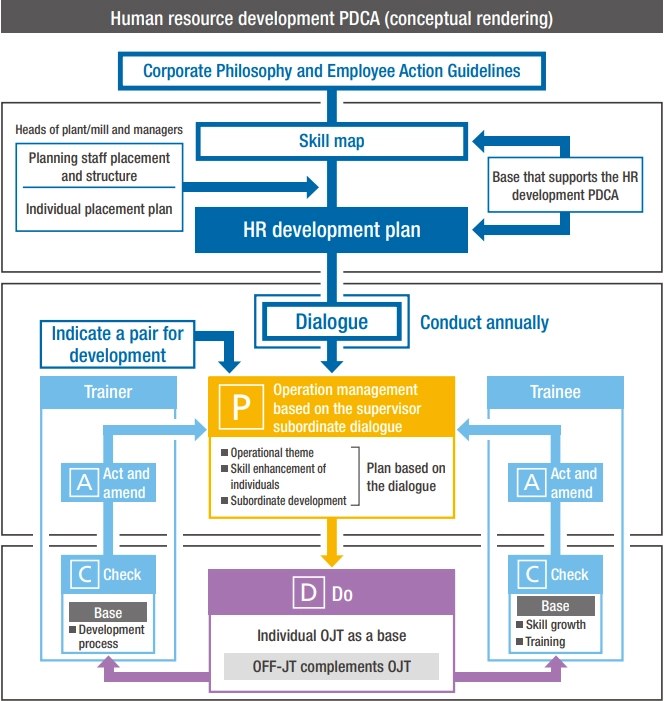 Following the organizational strategy based on the Corporate Philosophy and Management Policy, the Nippon Steel Group uses an HR Development PDCA for office staff and engineers to effectively implement and establish the development of human resources. A development plan is formulated for each person, and an annual detailed plan is a base for the OJT, which is aligned with the supervisor-subordinate dialogue based on the assignment commitment sheet. At the end of a fiscal year, they look back the status of development, which leads to formulation of the plan for the following year. By reviewing performance, personnel who can deliver a strategy for each organization are systematically developed.