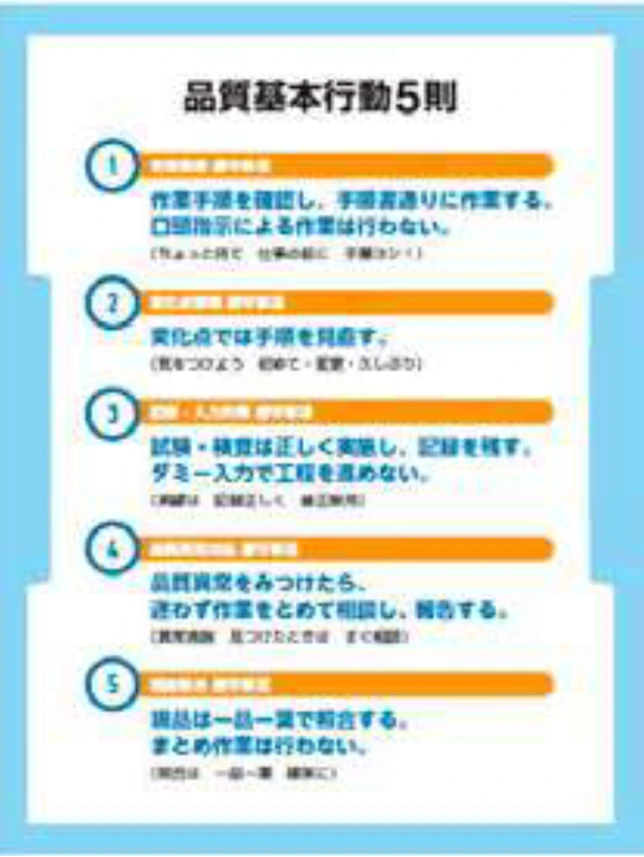 Based on the analysis of the causes of past quality issues, we have established the basic principles that employees involved in quality management should follow and are working to disseminate them as the Five Basic Rules of Quality Behavior. To improve the reliability of testing and inspection, we also work to eliminate risks from human intervention by automating data retrieval and introducing systems for product identification and product quality judgment before shipment.
