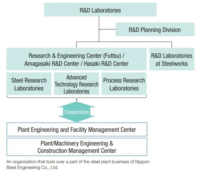 R&D is carried out with the R&D Laboratories as a core. The Steel Research Laboratories are mainly engaged in product development; the Advanced Technology Research Laboratories in discovery of new technology seeds from basic research and R&D related to segment companies; the Process Research Laboratories in process development; and the R&D Laboratories at Steelworks in practical application research. Thus, we are dividing our organization to be in charge of R&D management that contributes to our global management. In addition, we have contributed to the early practical application of developed products and processes in cooperation with Plant Engineering and Facility Management Center, which oversees equipment engineering, and newly-established Plant/Machinery Engineering & Construction Management Center, which is engaged in the design and construction of steelmaking plant facilities. We will promote the development of products and processes for the CN society by utilizing the existing framework of the three laboratories. Furthermore, we will strengthen cooperation with universities and research institutes in the fields that require basic examination, including elemental technologies that our group does not possess.