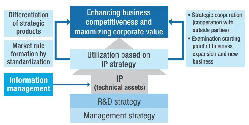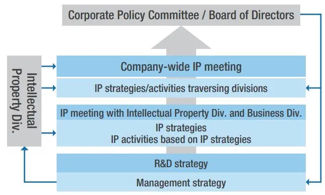 Business divisions take the lead in making a trinity of management strategy, R&D strategy, and intellectual property strategy, and then carry out specific intellectual property activities. These activities are supported by the Intellectual Property Division. In addition, the Intellectual Property Division is actively involved in management from a traversing perspective regarding intellectual property activities that span business divisions. After discussing the progress of these activities at the company-wide meeting and determining the direction of how to proceed with intellectual property activities, the final decision is made by the Corporate Policy Committee and the Board of Directors. In addition, the results of discussion in the Corporate Policy Committee and the Board of Directors are fed back to the business divisions and people involved in the inventions to strengthen the daily intellectual property activity. Further, through continuous information management and intellectual property training, we are improving the awareness and skills of all the employees related to intellectual property.