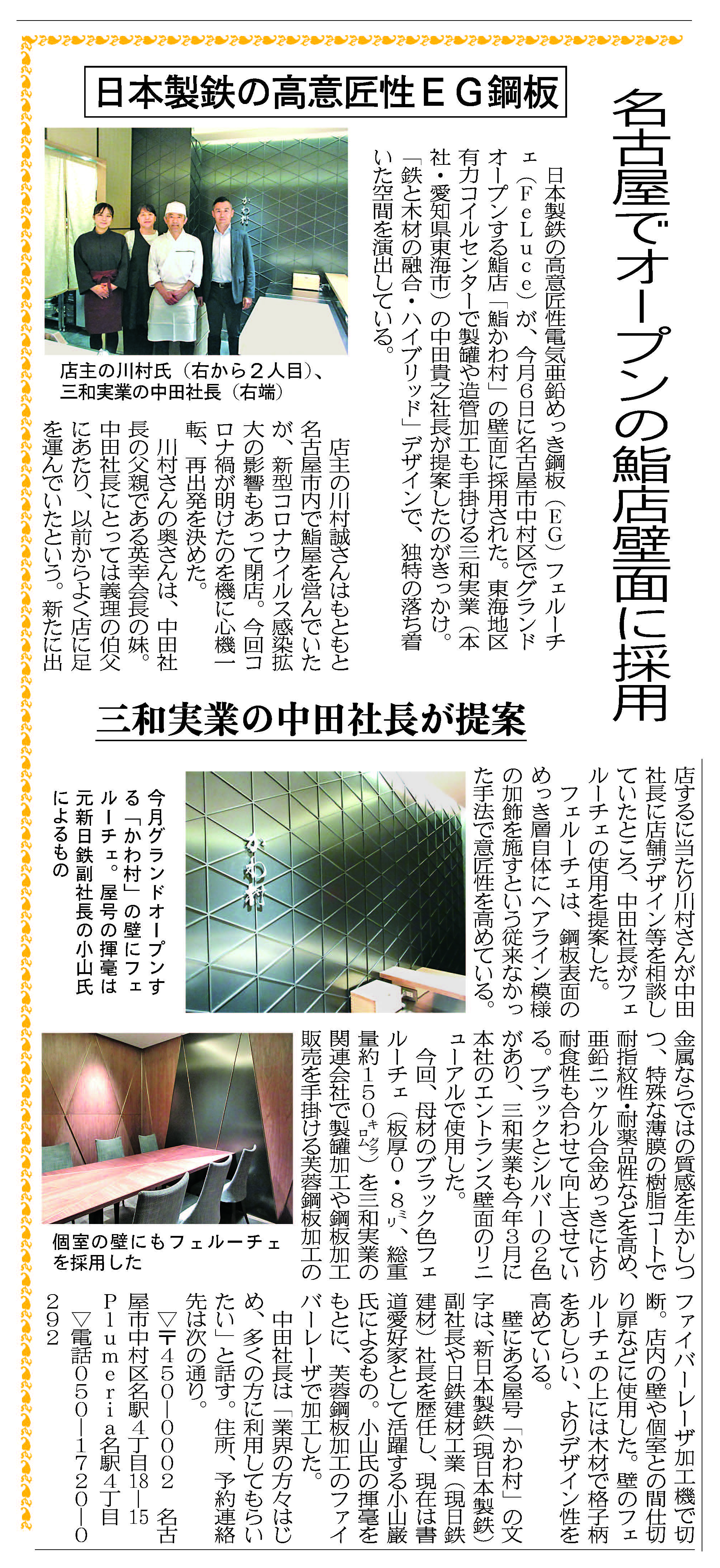 鉄鋼新聞に『日本製鉄の高意匠性EG鋼板 名古屋でオープンの鮨店壁面に採用』が掲載されました。
