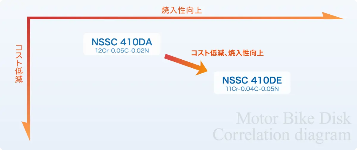 オートバイに装着時、外面に露出するため、耐食性が必要とされる、二輪ディスク用に最適なステンレス鋼です。