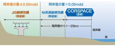 コルスペースは、特に塩害の厳しい環境で従来鋼に比べより効果を発揮することから、耐候性鋼橋梁の適用できない沿岸地域や、凍結防止剤散布の影響を受ける部位で特に、効果を発揮します。