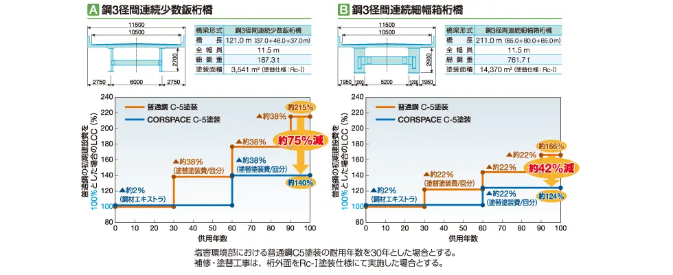 CORSPACEは普通鋼に比べ塗装周期の延長を可能とし、ライフサイクルコストを低減します。