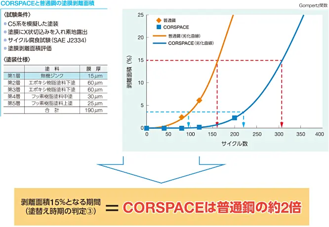 - CORSPACEは、塗膜劣化や塗膜厚の薄い部位における鋼材の腐食を抑制する機能があります。