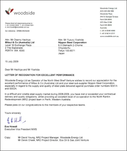 これまで、当社海洋構造物厚板の高い品質と安定したデリバリーが評価され、SHELLやWoodside、Phillips(現:ConocoPhillips)など世界の主要なオイルメジャーから感謝状などを授与されております。