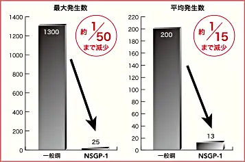 従来鋼適用船は5年たつと、深さ4㎜以上の孔食がタンクあたり、最大1300個発生するのに対し、NSGP-1を使用すると約50分の1、平均でも約15分の1の発生に抑えらています。