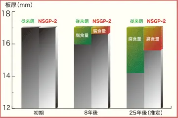 従来鋼とNSGP-2を実際の船で10年使用した結果から、25年後の腐食量を推定すると、従来鋼は2㎜を超えるのに対し、NSGP-2は約6割も腐食量を抑えることが予測できます。