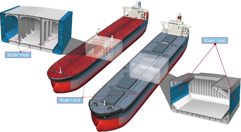 船舶の衝突パターンを研究し、燃料タンクを含め船舶側部を幅広くカバーする「NSafe®-Hull」。独自の成分設計と結晶粒レベルの組織制御で高延性を実現。さらに、従来鋼と同様の施工性(切断・曲げ・溶接・塗装)も実現しました。「NSafe®-Hull」ならではの安心・安全を実感していただけるはずです。