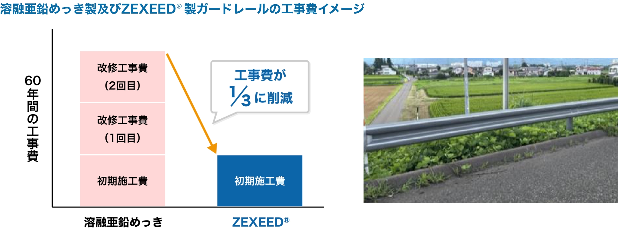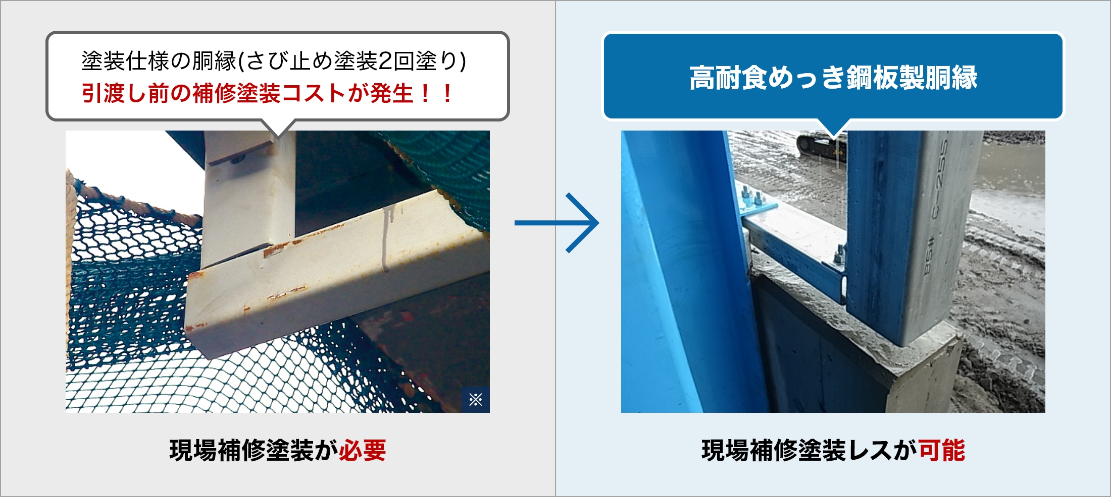 メンテナンス補修塗装レスが可能となり、ライフサイクルコストの低減が図れます。