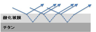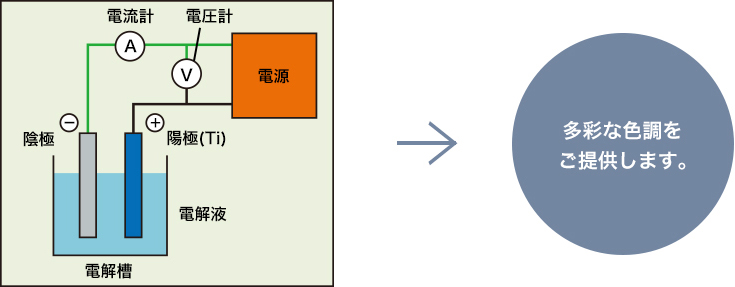 酸の溶液中でチタンを陽極として電圧を与えることにより、表面の酸化被膜を成長させます。