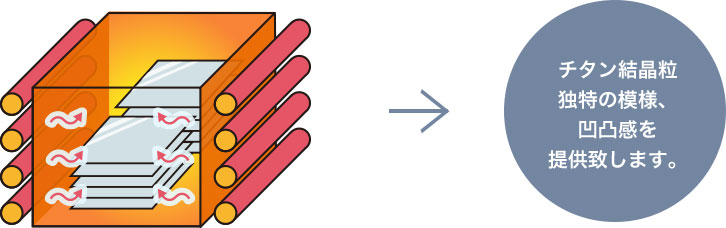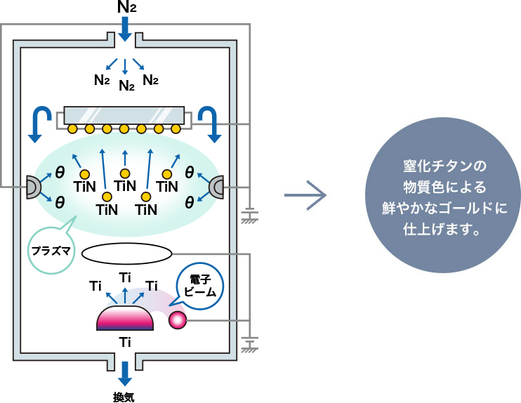真空中でイオンプレーティング法により、金色の窒化チタン膜をチタン板の表面に生成させます。