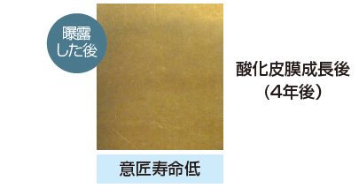 変色部位を調査した結果、変色部分の酸化被膜中および、チタン地金表面には微量の炭素、フッ化物が残存しており、種々の実験の結果、こうした物質が酸性雨と反応して酸化被膜を成長させることがわかりました。