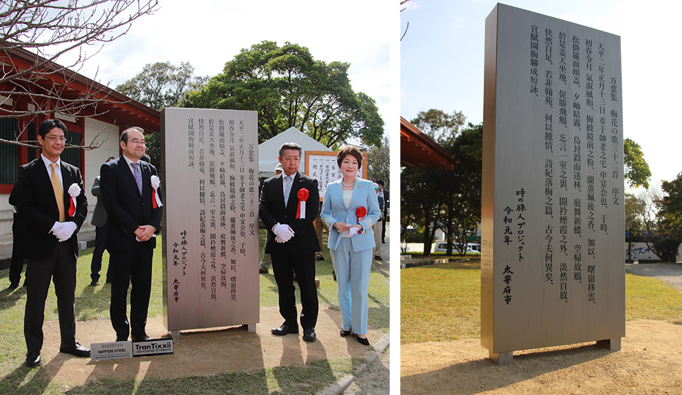 門谷社長と協議を進める中で、日本製鉄(株)が取り扱う「時を超える素材」との異名をとるチタン素材「TranTixxi」のご紹介がありました。私はこの時、掲げたコンセプトにピッタリの素材だと感じ、「TranTixxii」の採用を即決しました。 そうして名づけたプロジェクトの名称が「新元号「令和」記念『時の旅人プロジェクト』~時空を超えて1300年~」です。「令和」の典拠であります万葉集梅花の歌三十二首序文と寄附者様の名前を刻んだ普遍的で美しいモニュメントを「TranTixxii」を使用して作製するという内容でしたが、非常に大きな反響があり、お陰様で617人分6,860千円ものご寄附をいただいたところです。 こうして数多くの関係者の皆様のご尽力のもと完成した記念モニュメントの除幕式も先日無事執り行われたところです。コンセプトにも掲げましたように、これから先の1300年もこれまでと同じ悠久の時の流れを受け継ぐものを創り上げていく、ものづくりのまちとしても発展できるよう展開を図ってまいります。 結びとなりますが、2020年は、東京オリンピック・パラリンピック聖火リレー開催や、福岡県では51年ぶりとなります全国史跡整備市町村協議会総会が本市において開催されますことから、国内外から多くのお客様を本市にお迎えすることとなります。「令和」発祥の都にふさわしく、住まう人も訪れる人も共に慶びを分かち合える、日本を代表する世界に冠たる都に向け、更なる努力を続けてまいります。