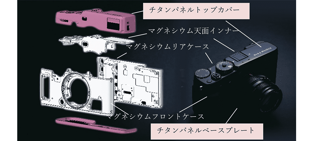 チタンが使用されているのは、ボディ外装のトップカバーとベースプレートで、ダイヤル部やフロントファインダー窓部など、高度な絞りや張り出し加工技術が要求される箇所です。加工メーカーとの密接な連携により、高強度を保ちつつディテールにこだわった複雑なデザインを可能にしました。