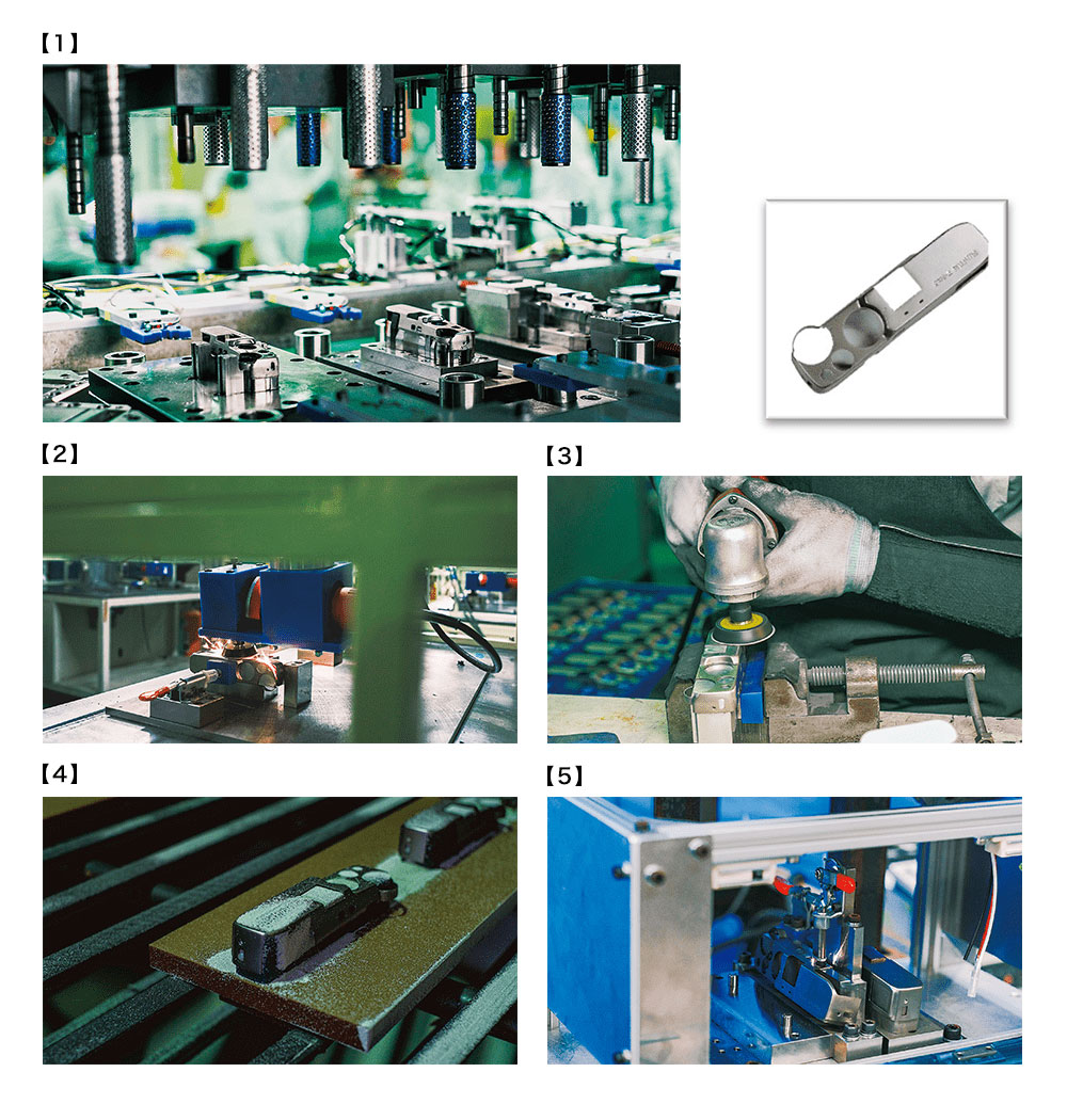 プレス金型でチタン板を加工(1)したあと、表面をロボット(2)や手作業(3)で磨きます。ブラスト処理(4)で表面の粗さを均一化したうえで、特殊コーティングなど加飾処理を施し、最後に部品のゆがみを補正して、ロゴをレーザーで印字(5)すると完成。擦り傷への高い耐性と高品位な外観をつくり込んでいます。