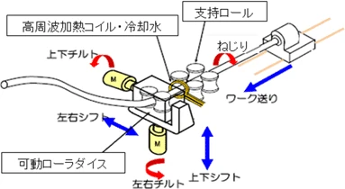 鋼管を局部的に加熱しながら水冷によって焼入れしつつ、同時に下図のように可動ローラダイスにより曲げモーメントを与えることによって曲げ加工を行い、複雑な形状をした閉断面構造部材を一工程で製造します。3次元加工を行うとともに同時に焼き入れを行う逐次成形法であり、従来のハイドロフォームをはじめとする冷間加工では達成不可能な効果を得ることが可能になります。