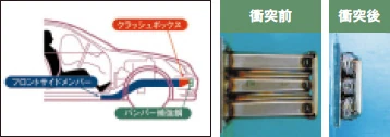 落錘試験で得られたノウハウをもとに開発した製品のひとつにクラッシュボックスがあります。クラッシュボックスは自動車のボディに組み込んで衝突時のエネルギーを吸収するための部品です。当社のクラッシュボックスは、軽量で効率よく衝突エネルギーを吸収することで高い評価をいただき、安全で燃費の良いクルマに採用されています。