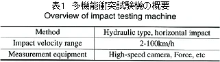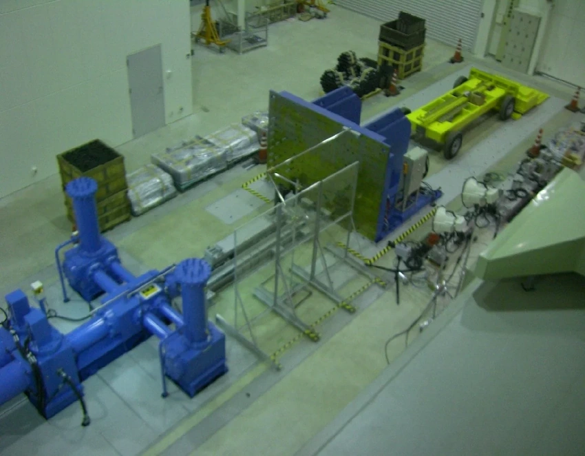 部材単体から大型構造までの衝突試験が行えます。油圧による水平打ち出し方式を採用しており、多様な形態での衝突評価が可能です。またその衝突速度は最高100km/hであり、現行のすべての自動車アセスメントの衝突試験の速度領域を網羅しています。さらに種々の高精度計測装置を備えることで部材や構造の衝突変形時の挙動を詳細に観察でき、衝撃吸収性能の評価と変形メカニズムの検討が可能です。