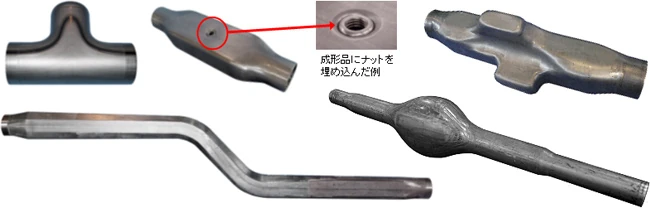金型内に装着された鋼管に、内圧と軸方向押し込みを負荷することで複雑な形状に成形する技術です。