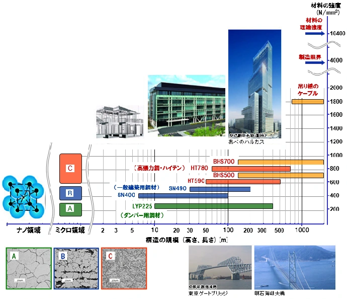 鋼材の強度は理論的には更に高くできると考えられており、積極的な研究開発を推進しています。