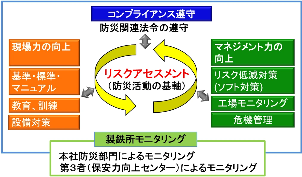 当社の防災活動は、① 防災法令の遵守とリスクアセスメント活動による事故の未然防止対応 ② 発災事案の再発防止対策の徹底と発災時の減災に向けた現場での適切な初動 ③ 防災管理活動の実行状況を定期的にモニタリング。各製鉄所の製造現場を主体とした自律的な防災活動の確立を目指して取り組みを継続しています。