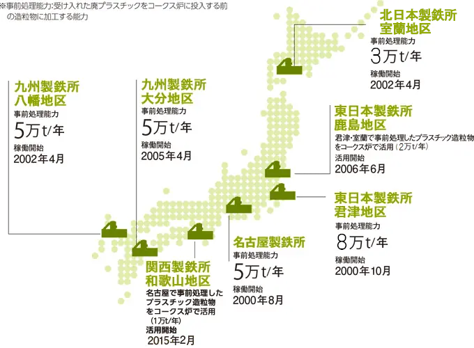 当社は、容器包装リサイクル法に基づき一般家庭から回収された廃プラスチックを、コークス炉を使ったケミカルリサイクル法により100%再資源化しています。