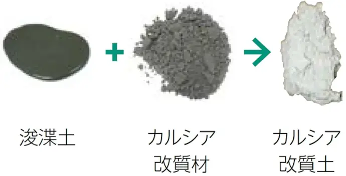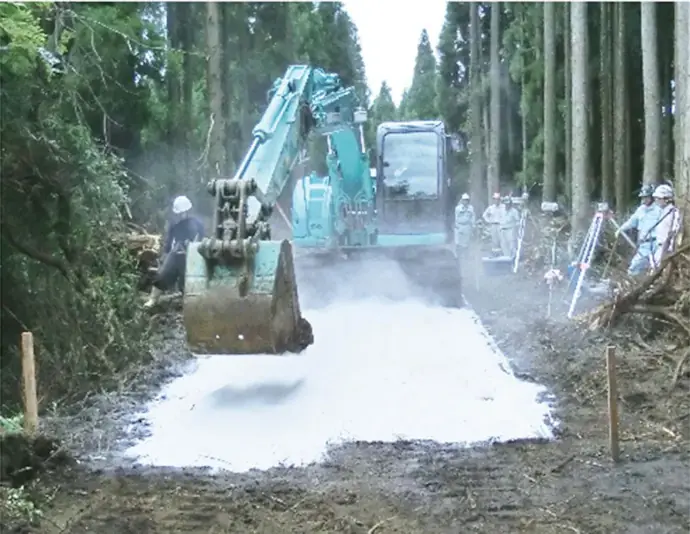 製鋼スラグを原料として製造したジオタイザー®は、陸域における軟弱土(建設残土、農地土等の泥土)に混合して利用可能な土に改良することができます。従来の改良材(セメントや石灰等)に比べて粉じんが少なく、CO2排出量を大幅に抑制可能で、安価なため工事費の縮減ができます。改良土は転圧性に優れ、過度に固化せず再掘削性を有しています。