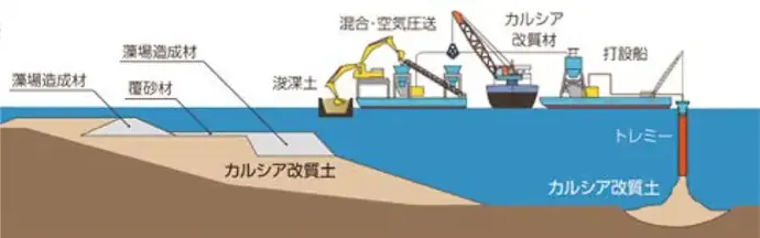 製鋼スラグを原料としたカルシア改質材と、浚渫土を混合して製造したカルシア改質土は、海底の深掘れの埋戻し材や浅場・干潟の造成材として利用でき、海域環境の改善に利用されています。また、製鋼スラグと廃木材由来の腐植物質を混合したビバリー®ユニットは、海藻類の生育に必要な鉄分を供給し、磯焼けした海の再生に貢献します。