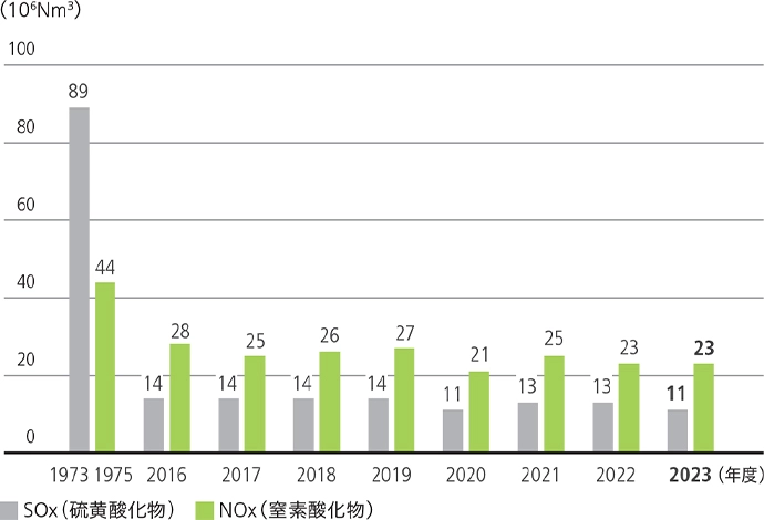 当社は、SOx(硫黄酸化物)、NOx(窒素酸化物)の排出低減のため、SOx・NOxを除去する設備の設置、NOx生成が少ないバーナーの採用、低硫黄燃料への転換等、効果的な対策を実施しています。