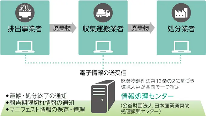 電子マニフェスト制度は、マニフェスト情報を電子化し、排出事業者、収集運搬業者、処分業者の三者が情報処理センターを介したネットワークでやり取りするしくみです。