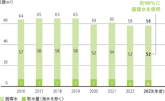 当社は、事業活動における水使用量の継続的な削減に努めています。全製鉄所で使用する年間約58億m3の工業用水のうち、約90%に循環水を使用し、大切な水資源の有効利用・排水量の抑制に努めています。そのために循環水冷却設備・排水処理設備等の機能を維持・改善し、排水の水質をきめ細かに点検管理する等、日々の努力を継続しています。当社の国内事業拠点には、WRI Aqueductによる水ストレス評価において、高ストレスに晒されているところがないことを確認していますが、取水制限に至った場合に備え、九州製鉄所八幡地区など一部の製鉄所では独自の貯水池を配備し水源を確保しています。状況によっては、農業用途への応援給水に協力する等、地域単位での水ストレスの緩和にも貢献しています。