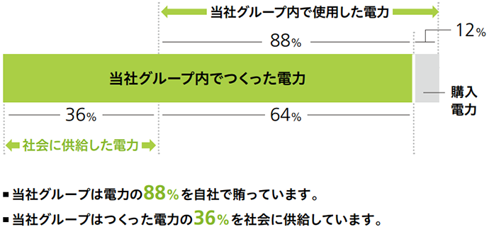 使用電力の88%を自家発電しており、その内68%は排熱および副生ガス等の所内発生エネルギーにより賄っています。今後、発電の更なる低炭素化に向け、設備の高効率化、燃料切り替え等も検討していきます。