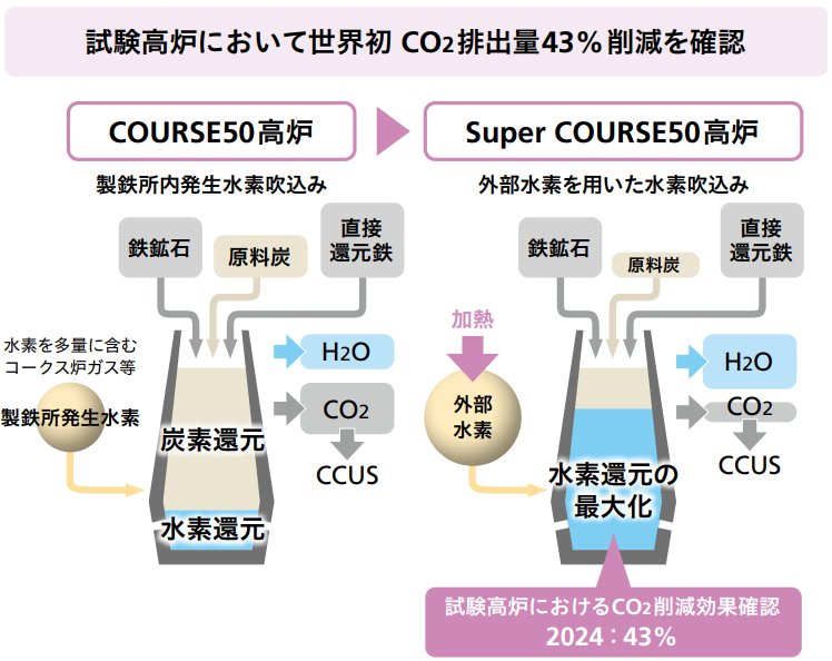 2024年に試験高炉において、世界最高水準の更新となるCO2排出量43%の削減を確認し、未来の製鉄プロセスの提案に向けて着実に開発を進めています。加えてCCUS等によるカーボンオフセット対策の研究開発も行い、複線的なアプローチでカーボンニュートラルを目指していきます。