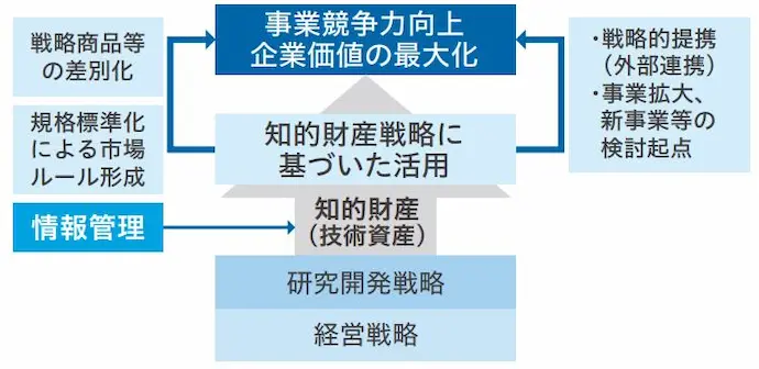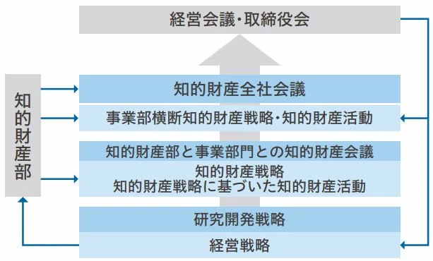 事業部門が主体的に、 経営戦略、 研究開発戦略、 知的財産戦略を三位一体化させた上で、 具体的な知的財産活動を実施しており、 知的財産部がその活動を支援しています。また、 事業部間にまたがる知的財産活動に関しては、 知的財産部が横断的な視点で積極的にマネジメントに関与しています。これらの活動進捗を全社会議において討議し、 知的財産活動の進め方につき方向付けした後、 最終的には経営会議および取締役会に諮っています。また、 経営会議および取締役会における議論の結果を事業部門や発明関係者にフィードバックして日々の知的財産活動を強化しています。更に、継続的な情報管理および知的財産についての研修を通じて、 知的財産に関する全社員の意識とスキルの向上を図っています。