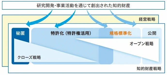 当社では、研究開発や事業活動を通じて創出した知的財産を、下図([研究開発・事業活動を通じて創出された知的財産])のとおり知的財産戦略に基づき秘匿、特許化、規格標準化、公開を組み合わせて事業に活用しています。規格標準化については、下図([規格標準化に係る当社の活動])のとおり品質保証、安全、環境、防災に係る社内活動をはじめ、JIS・ISO・API等に関する外部での活動にも積極的に参加して、鋼材および材料試験法等の規格化に取り組んでいます。鉄鋼製造のサステナビリティ基準や自社および他社の商品を投入する市場のルールを整えて、新商品の拡販等につなげて経営に貢献するとともに、鉄鋼業界が対象とする市場の形成とその拡大を図っています。自動車用鋼板・材料分野では、延性試験委員会ISO/TC 164/SC 2の議長に当社社員が就任して、規格活動をけん引しています。また、石油・ガス開発・生産環境向け鋼材製品に関連する分野では、当社社員が油井管に関する規格化を推進し、その功績が認められ米国AMPP (Association for Materials Protection and Performance:米国の材料腐食防食協会)の「2024 AMPP Fellow Honor Award」を受賞しました。