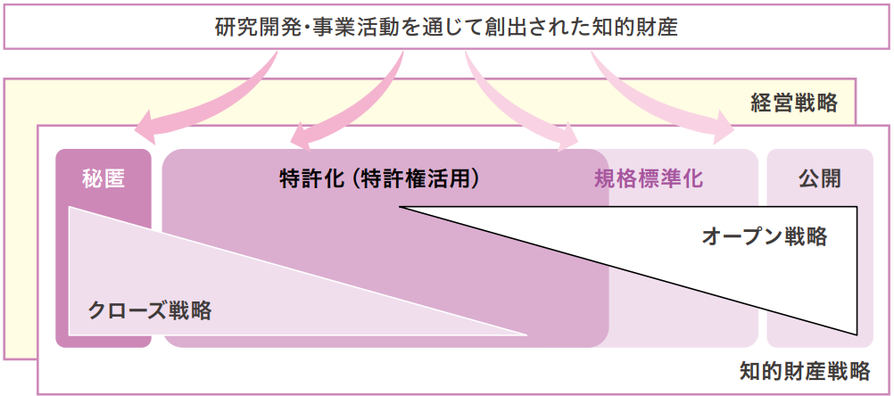 当社は製造・研究開発等の活動を通じて獲得した知的財産を、各事業領域の経営戦略に基づく競争優位性の確保・拡大のため、「秘匿」「特許取得」「規格・標準化による市場拡大」「公開デファクト化」を組み合わせて活用する知財活用ソリューションを推進しています。
