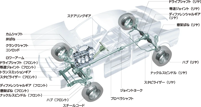 自動車用特殊棒鋼・線材は、クランクシャフト、コンロッド、ギア、弁・懸架ばね、ボルトなどの各種部品に幅広く使われています。見えないところで自動車の「動く、曲がる、止まる」の基本性能を支えるとともに高機能化した棒鋼・線材から造られる部品は低燃費化にも貢献しています。