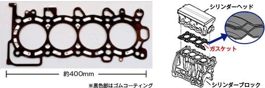 シリンダーヘッドガスケットはエンジンのシリンダーヘッドとシリンダーブロックとの間で使用される重要なシール部品です。基本的には薄板素材にビードと呼ばれる凸部が成形され、ビードのばね性が、燃焼を繰り返すエンジンの振動や熱変形による隙間の発生を防止し、高温の燃焼ガス、冷却水、潤滑油を分離密閉し続けています。このため、素材には優れたばね性と耐食性などが必要であり、一般に高強度ステンレス鋼が使用されています。また、表面には薄いゴムがコーティングされ、シール性を向上させています。
