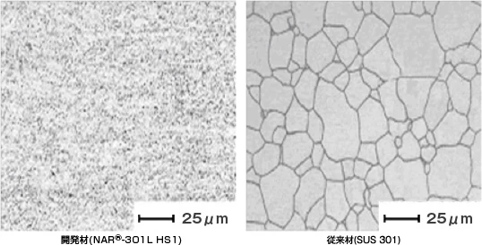 このようなお客さまのニーズや環境問題に応えるために、シリンダーヘッドガスケット向けのステンレス鋼「NAR®-301L HS1」を開発しました。このステンレス鋼は、結晶粒径を従来鋼の20μmから2μm以下に超微細化することで高いばね特性と疲労強度を持ちながら、従来並の良好な加工性を確保しています。特に、疲労特性は、従来のステンレスばね鋼の1.4倍という飛躍的進歩を遂げました。