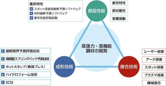 「鉄鋼材料」が最終の「商品」になるまでには、成形・接合などの加工および商品の性能評価が欠かせません。当社では、材料特性を正確にモデル化することで、プレス加工やハイドロフォーム加工などの成形加工に加え、鉄が使用される条件での各種性能の評価を可能とする高度な数値解析技術を構築しています。併せて部品レベルで性能を評価する実験技術も保有しています。